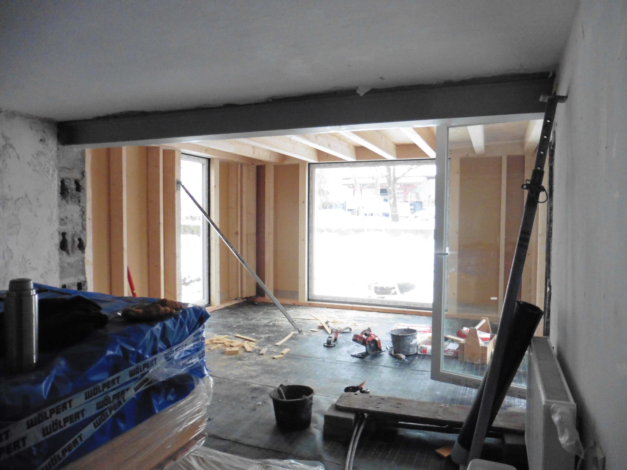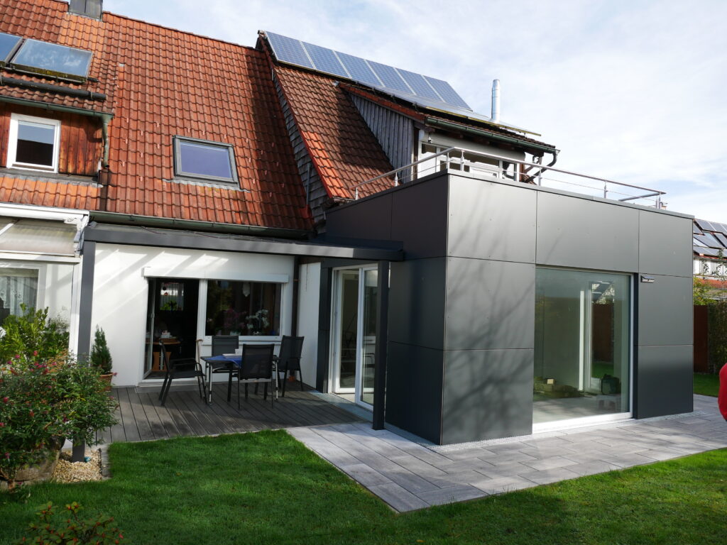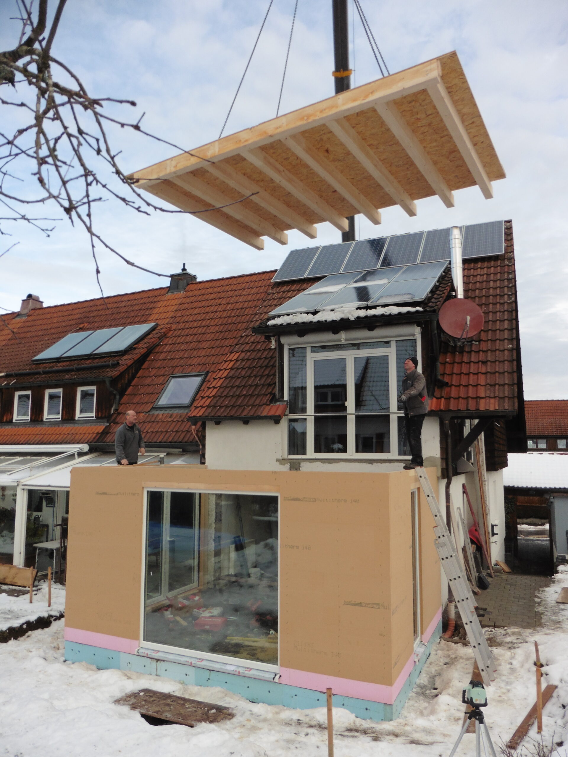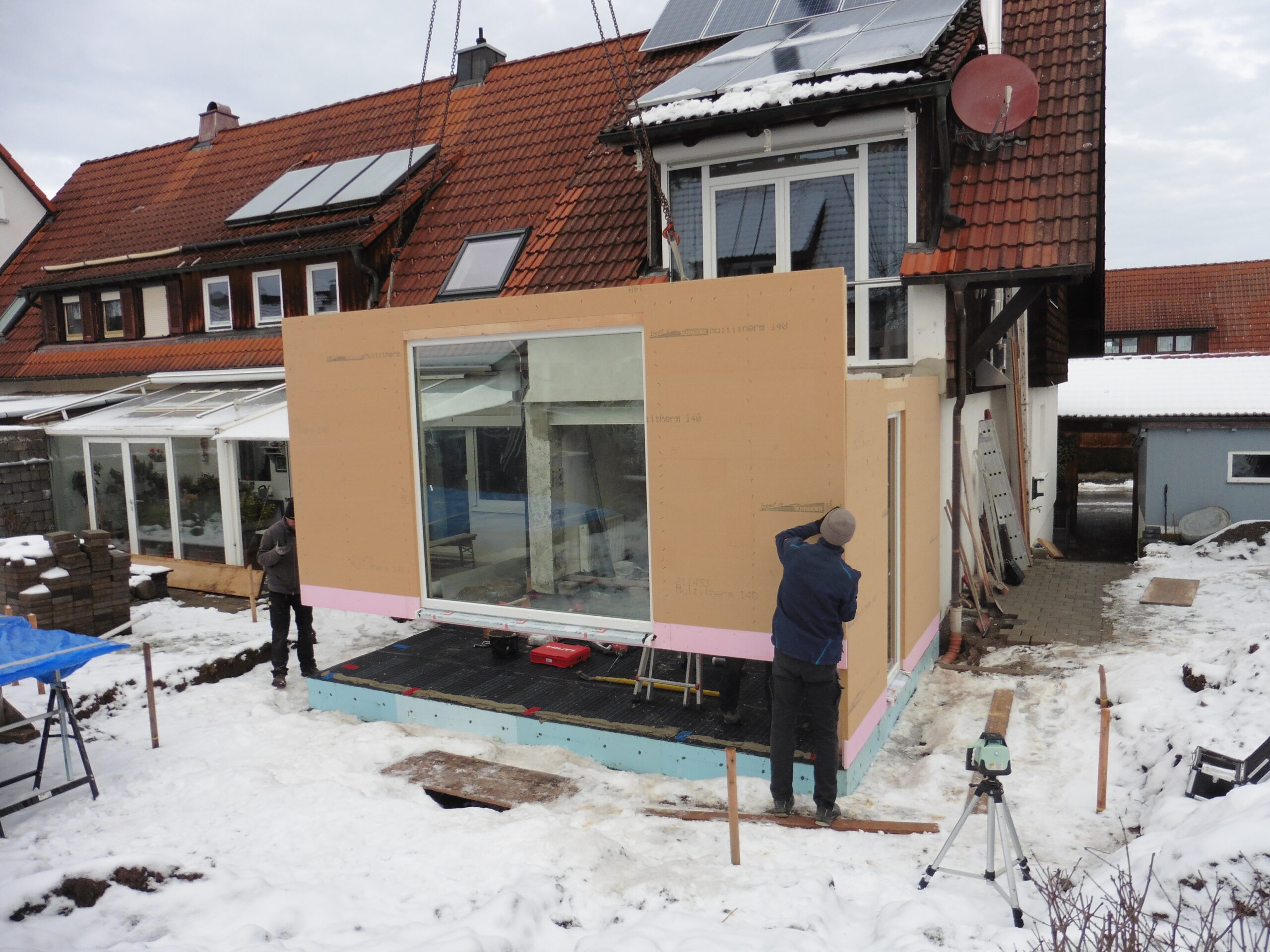 Das Wohnzimmer im Erdgeschoss des Zweifamilienhauses war klein und dunkel, da es durch den Balkon im Obergeschoss verschattet wurde. Deshalb beschloss die Familie einen Anbau zur Vergrößerung des Wohnzimmers und darauf eine Dachterrasse für das Obergeschoss zu bauen. Dieser Anbau wurde als Holzrahmenbau ausgeführt und in nur einem halben Tag auf der vorher schon erstellten Bodenplatte errichtet.