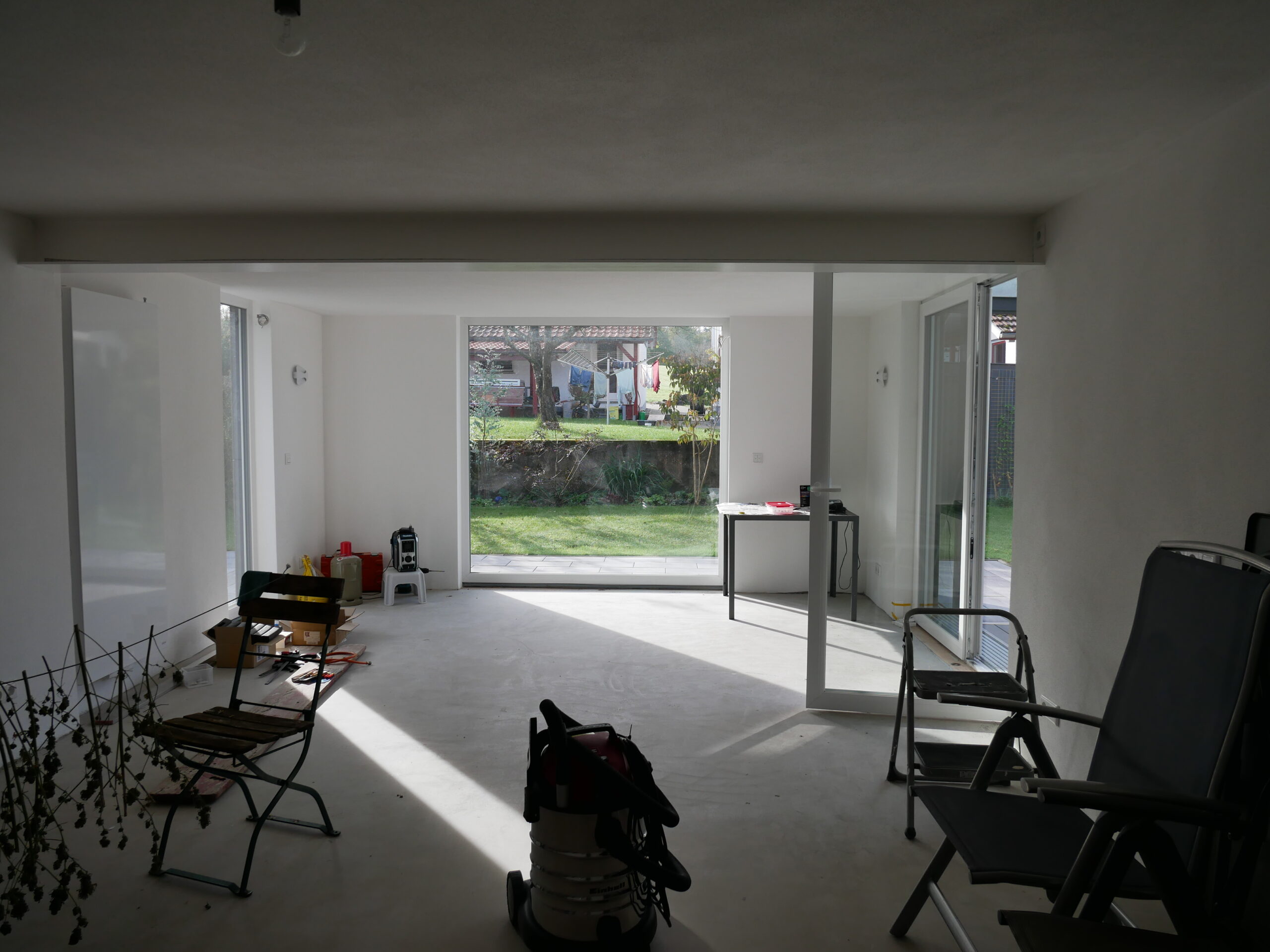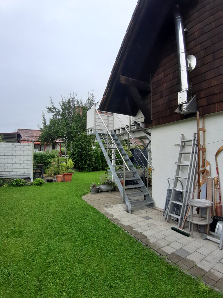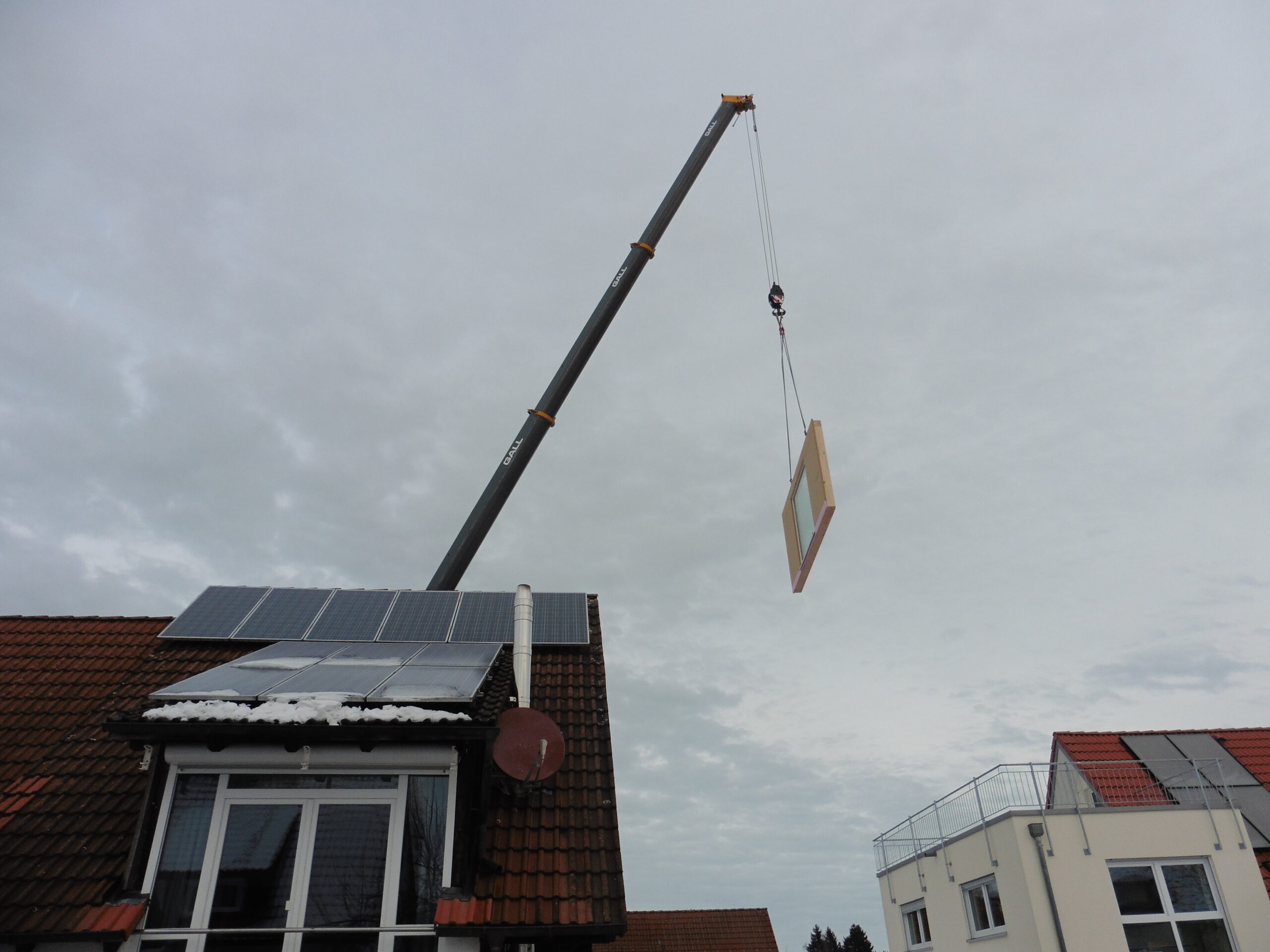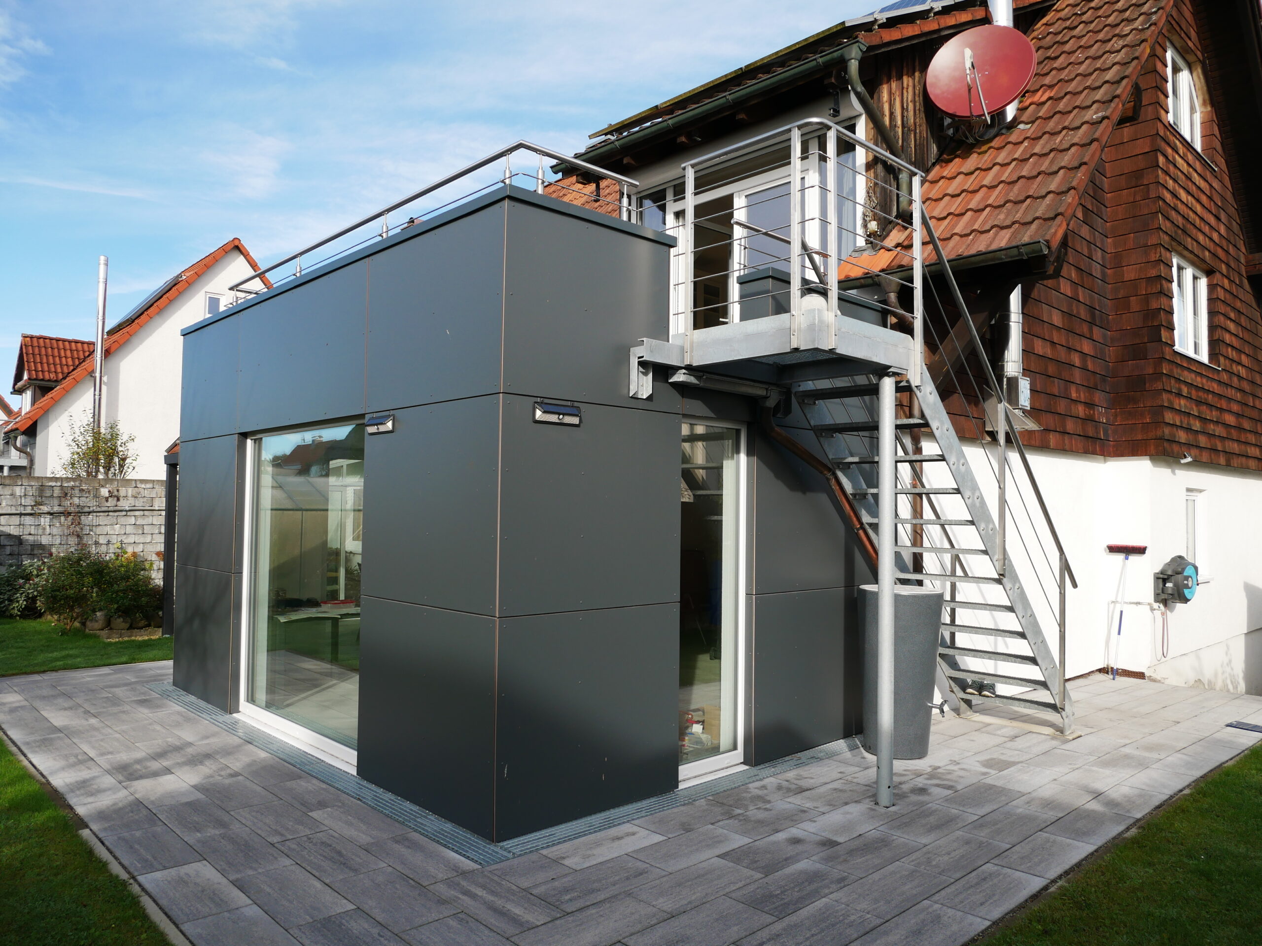 Das Wohnzimmer im Erdgeschoss des Zweifamilienhauses war klein und dunkel, da es durch den Balkon im Obergeschoss verschattet wurde. Deshalb beschloss die Familie einen Anbau zur Vergrößerung des Wohnzimmers und darauf eine Dachterrasse für das Obergeschoss zu bauen. Dieser Anbau wurde als Holzrahmenbau ausgeführt und in nur einem halben Tag auf der vorher schon erstellten Bodenplatte errichtet.
