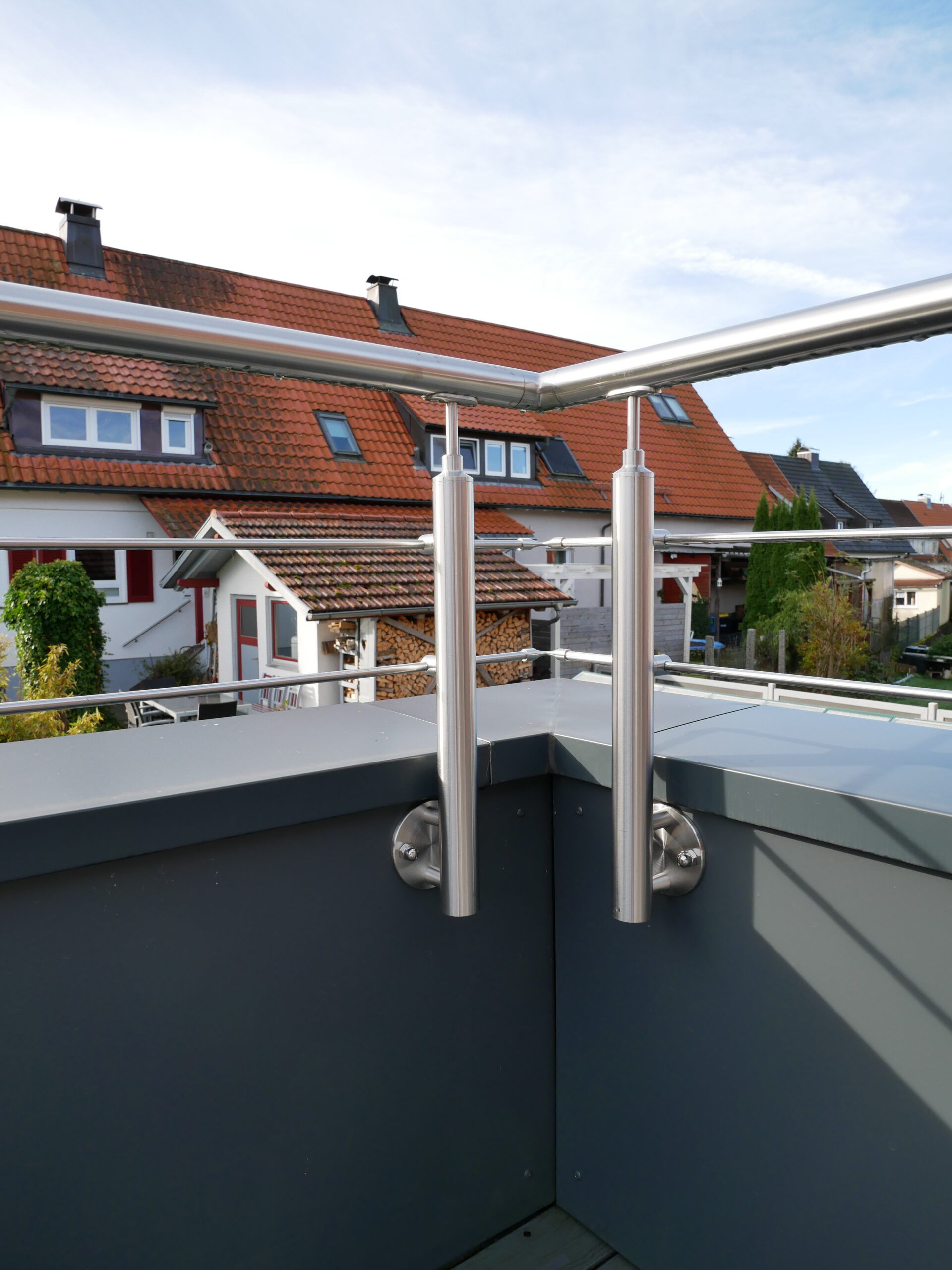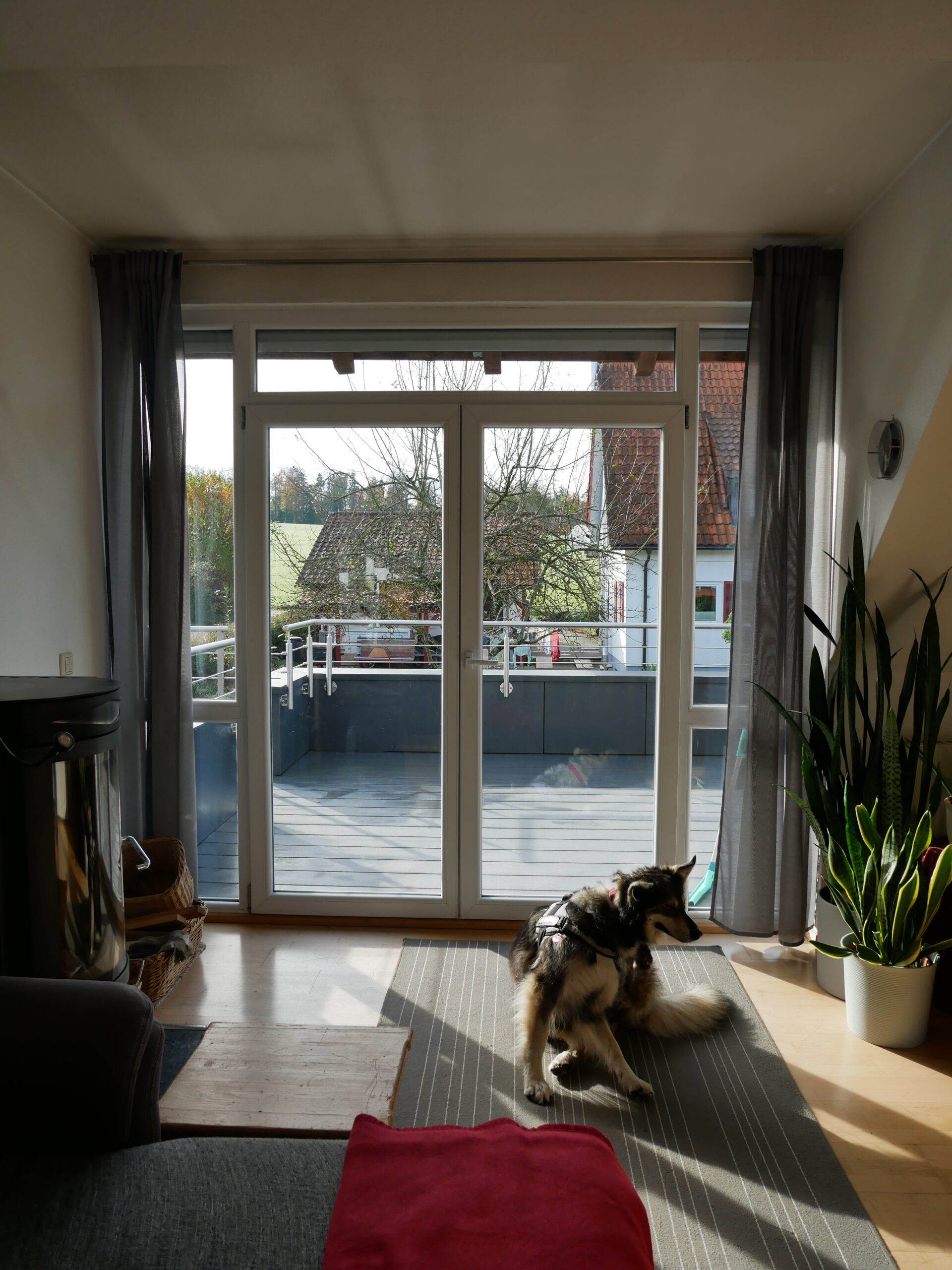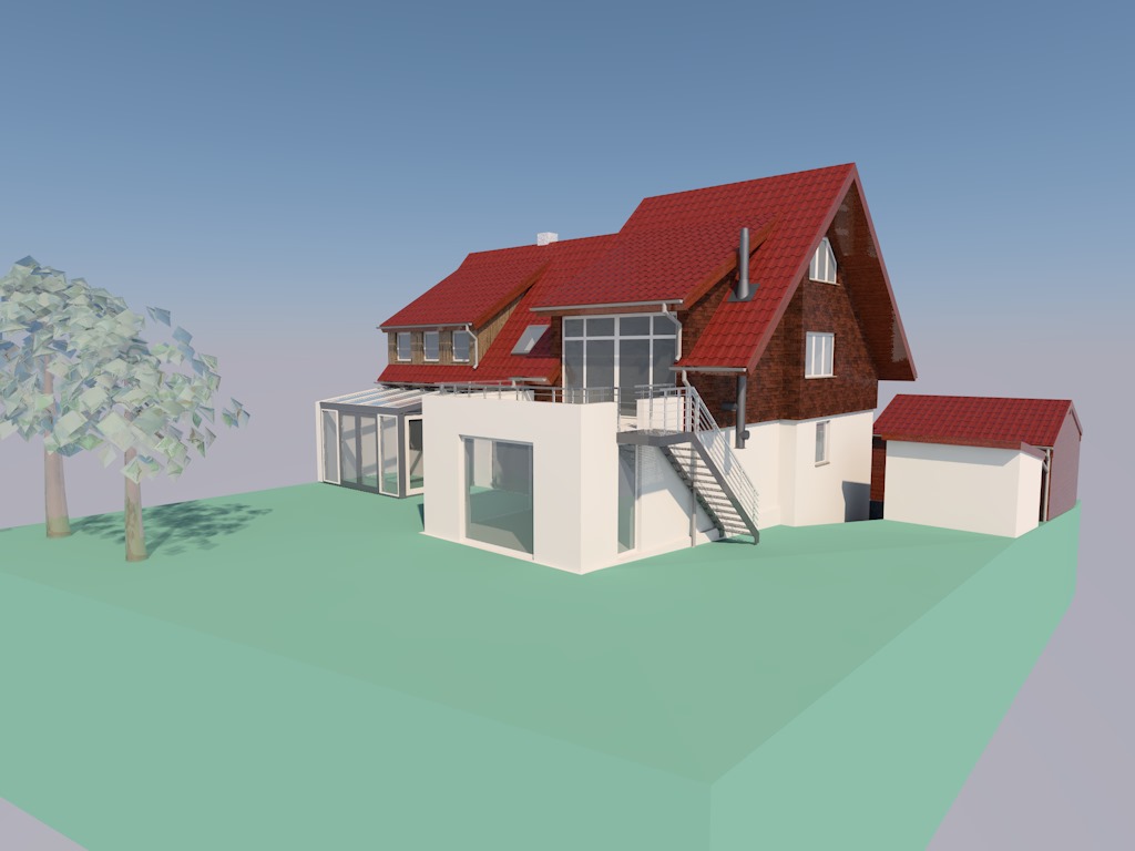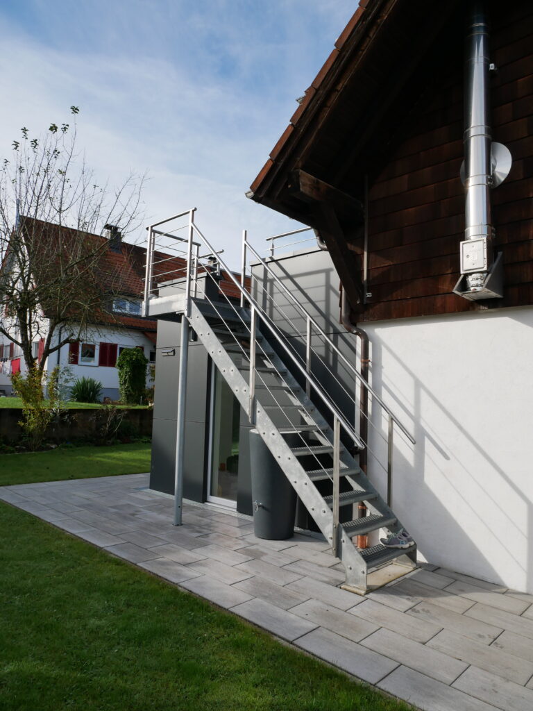 Das Wohnzimmer im Erdgeschoss des Zweifamilienhauses war klein und dunkel, da es durch den Balkon im Obergeschoss verschattet wurde. Deshalb beschloss die Familie einen Anbau zur Vergrößerung des Wohnzimmers und darauf eine Dachterrasse für das Obergeschoss zu bauen. Dieser Anbau wurde als Holzrahmenbau ausgeführt und in nur einem halben Tag auf der vorher schon erstellten Bodenplatte errichtet.